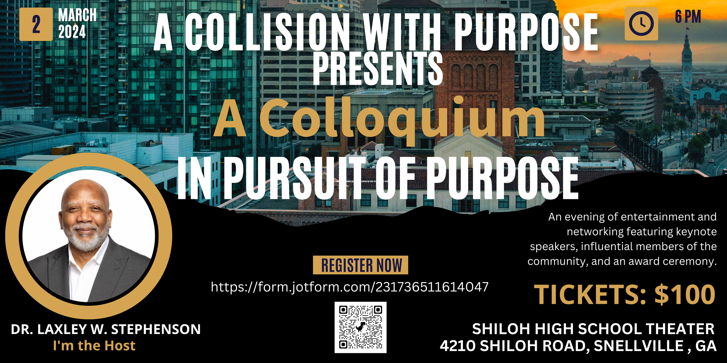 Join us for a captivating evening filled with entertainment, enriching conversations, and the opportunity to connect with like-minded individuals. The event will spotlight distinguished keynote speakers, celebrate achievements during our award ceremony, and honor standout members of our community. Plus, seize this unique chance to obtain a signed copy of "A Collision With Purpose: In Pursuit of Purpose" from the acclaimed Dr. Laxley Stephenson, author, life navigation coach, and the visionary behind the A Collision With Purpose Project. Take advantage of this unparalleled experience.